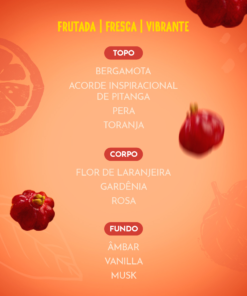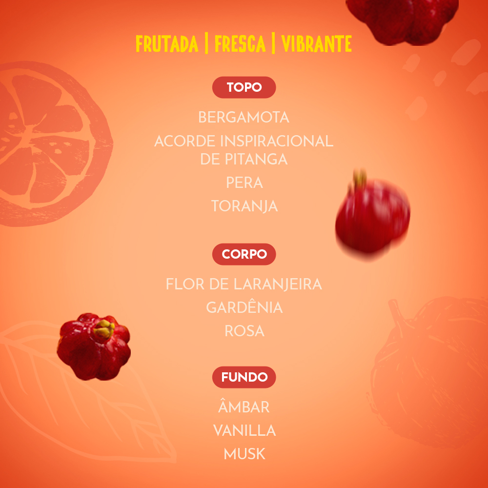 O Mist Desodorante Perfumado Bafafá é a tradução perfeita de um dia leve, fresco e ensolarado — o puro suco da brasilidade em forma de fragrância. Inspirado na alegria contagiante do povo brasileiro, o mist combina a suculência da Pitanga e o toque vibrante da Toranja com notas florais e frutais com um fundinho doce, resultando em uma fragrância frutal floral irresistível, ousada e cheia de atitude. Com sua fórmula leve e desodorante, o Mist Bafafá é ideal para quem exala leveza, cor e frescor. Cada borrifada é uma dose de energia tropical que envolve o corpo em uma perfumação vibrante e viciante, perfeita para dias ensolarados. A fragrância revela um equilíbrio delicioso entre o frescor das frutas, o toque delicado das flores e a cremosidade suave do âmbar e da baunilha.